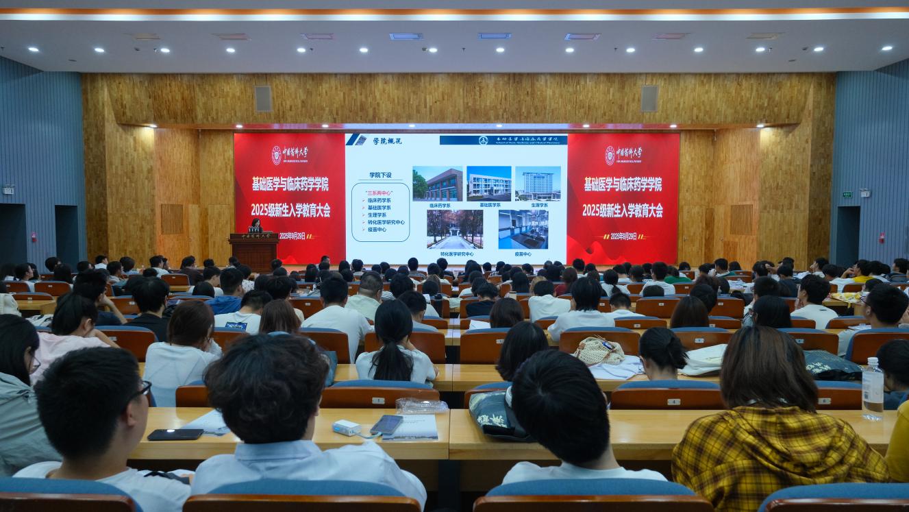 大会在雄壮的国歌声中拉开序幕。学院党委书记徐明代表学院向2025级全体新生表示热烈的欢迎,他鼓励同学们立大志,要胸怀“两个大局”,心怀“国之大者”,在大力弘扬和践行爱国主义精神的过程中,追寻人生意义、实现人生价值;要有担当,在服务健康中国建设中担当起生命所托、呵护生命、助力全民健康的时代责任;要有韧劲,在选择为梦想而奋斗的过程中,始终保持面对困难和挫折的勇气;要练本领,努力成长为“懂医精药、善做善成”的高层次临床药学人才,为人类的健康与发展而努力奋斗。他勉励新生们要肩负起时代赋予的使命,以“精业济群”为指引,努力成为健康中国的建设者和推动者。学院常务副院长胡容详细介绍了学院的发展历程、办学特色、科研实力及未来规划。她鼓励新生们要树立远大理想,培养专业情怀,成为有温度、有担当的新药临床研究与精准用药领域的高端人才。