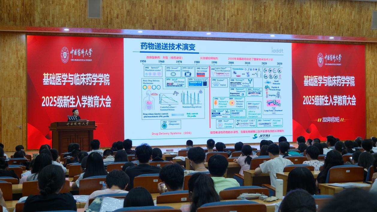 会上,江苏集萃新型药物制剂研究所所长全丹毅博士为全体新生开展了题为《生物医药产业发展趋势及挑战》的专题汇报。她结合自己在南京江北新区成立江苏集萃新型药物制剂技术研究所的过程通过介绍高载药量及掩味技术等五种高端制剂技术,为新生们提供了宝贵的行业洞察,并结合自己在中国药科大学从教、出国留学、国外工作、回国创业等个人的职业生涯经历,勉励同学们要保持积极心态、培养创新思维、勇敢面对挫折,用“十年磨一剑”的定力,推动新质生产力的发展,实现个人理想。