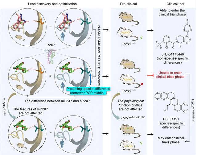 P2X 受体家族是药物开发的热门靶点,其中 P2X7 受体调控多种生理与病理过程,这也使得P2X7成为该家族中进入临床试验的亚型中数量最多的一个。但人类与模式动物之间P2rx7基因的差异导致配体对不同物种P2X7受体的调控存在巨大差异,这不仅对P2X7化合物的理性设计构成了巨大挑战,也增加了靶向该受体候选药物从临床前研究向临床转化的难度。该研究以PSFL1191和JNJ-54175446为探针,阐明了配体与PCP的具体结合机制。发现了PCP位点存在种属差异性的关键因子。基于这些见解,开发了P2rx7A312V/A312V小鼠,在保持P2X7特征和基本生理功能基础上,能准确反映存在种属差异性的P2X7抑制剂的体内活性,而这些化合物的活性在野生型小鼠上无法被有效评估。为存在种属差异性P2X7抑制剂的有效性和安全性评价提供了新方法(图1)。