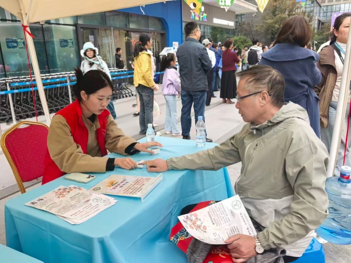 本次活动包括才艺表演、健康服务和游戏互动三个部分。学院志愿者孙烁硕同学为居民们献唱《枕着光的她》,为在场的居民送上浪漫与温暖;学院志愿者团队聚焦居民健康,现场提供血压、血氧、身高体重测量等服务,讲解“防治三高”知识并发放慢病防控宣传册、重阳节健康小知识传单,以专业医药技能为居民健康保驾护航。互动现场还组织了套圈游戏、“非遗体验”等活动,超百位居民现场参与,场面热烈。
