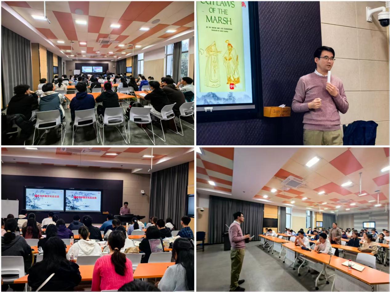 刘毅副教授以“翻译与中国文化走出去”为题,通过“四大名著”中国经典文学翻译案例解析,揭示翻译在文明互鉴中的双向桥梁作用。讲座深度剖析了《红楼梦》霍译本、杨译本等经典案例,展现翻译如何突破语言表层,传递“弦外之音”的文化密码。围绕不同翻译家针对《水浒传》、《三国演义》、《西游记》等经典文学中出现的英雄形象、诗词文学、中医药文化等具有中国特色的文化元素的翻译手段进行对比分析,帮助学生建立“直译与意译”、“术语准确性与文化适应性”的双重标准。
